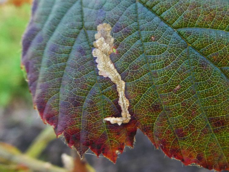 Bramble leaf mined by Bramble Blotch-miner (Coptotriche marginea Micro-Moth)