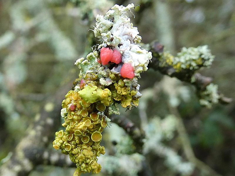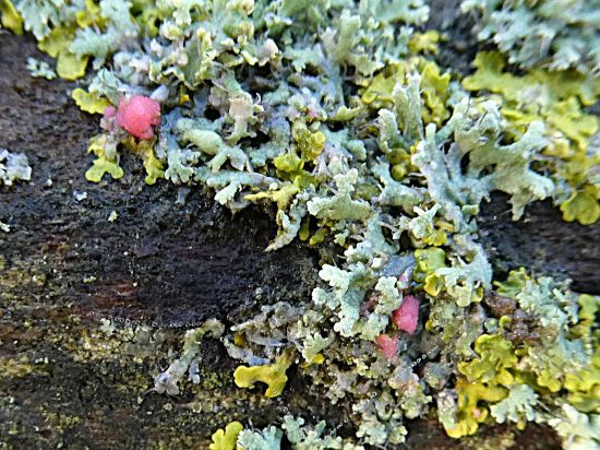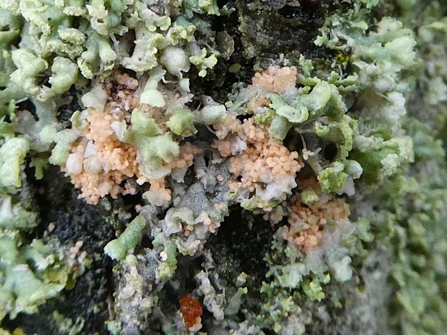Illosporiopsis christiansenil &.Erythricium aurantiacum are two of the most easily identifiable Lichenicolous Fungi.