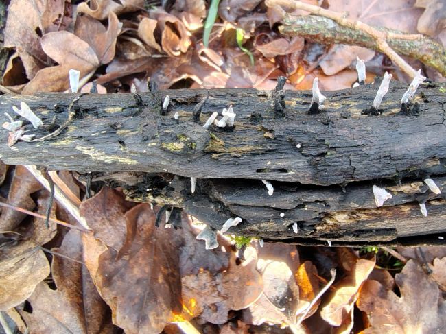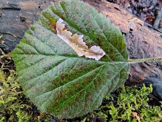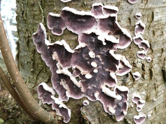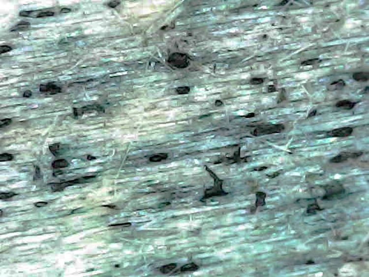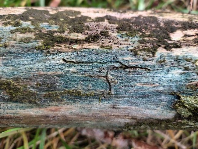 Blue/Green staining on bark stripped decaying deciduous timber is evidence of infection by the fungus Chlorociboria aeruginascensa and the almost identical rarer Chlorociboria aeruginosa The green cup fruitbodies are seen infrequently. Note the black apothecia belong to a crustose lichen. The infected wood known as 'green oak' was highly prized by fine woodworkers in the 18th and 19th centuries, who used this for intricate inlays for decorative wooden boxes.