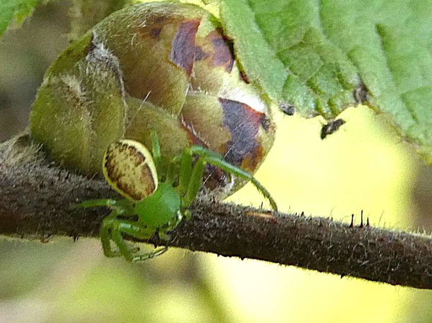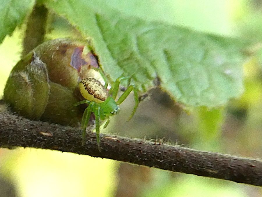 Diaea dorsata is one of the smaller crab spiders. Females can grow up to 6 mm, males up to 4 mm. This spider can change its colour to fit its surroundings; however, the process takes several days although this one seems well in control of how to hide next to the Hazel bud.